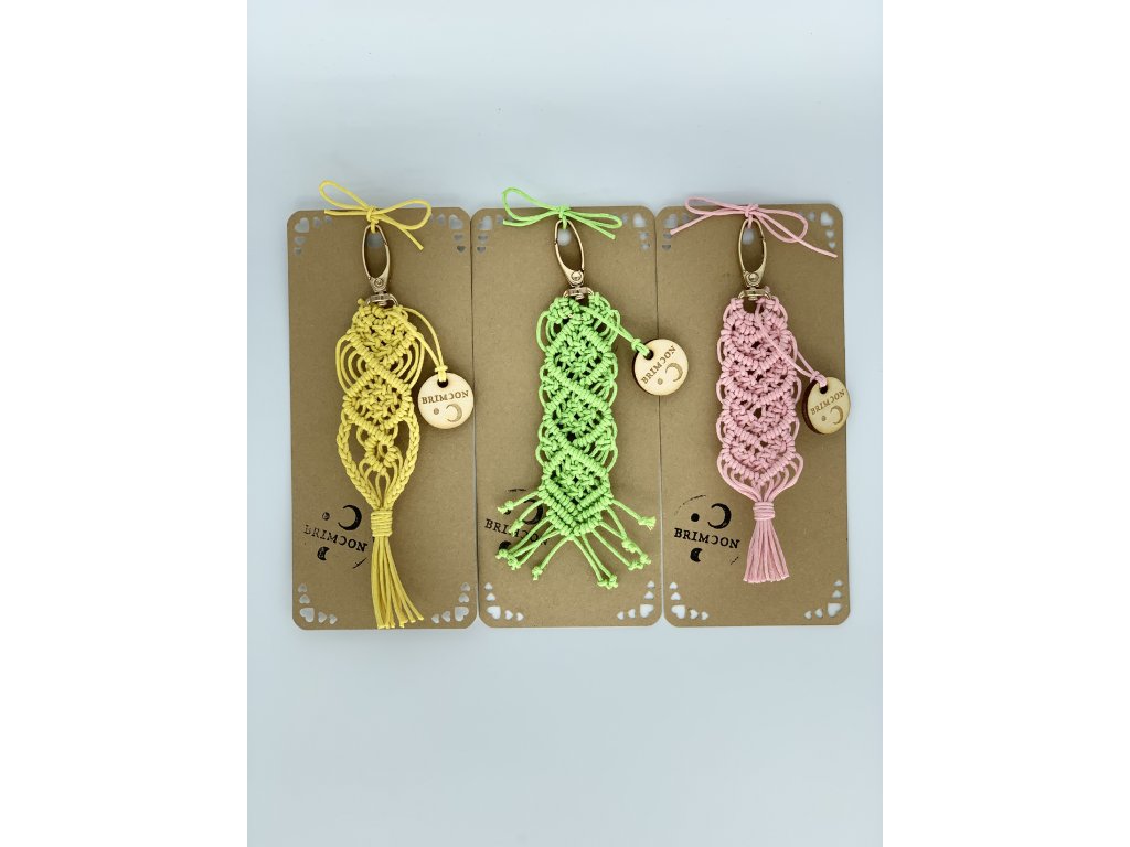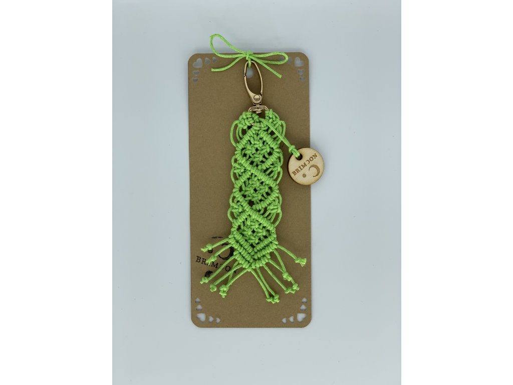 Klíčenka nebo přívěšek na kabelku s uzlíky. Vyrobeno ručně technikou macramé (drhání) z voskované šňůry. Klíčenka proto dobře drží svůj tvar. Barva výrobku limetkově zelená. Karabinka zlaté barvy. Rozměry klíčenky 13 x 3 cm. Baleno na hnědém papíře v papírovém sáčku, přívěšek je vhodný jako dáreček.
