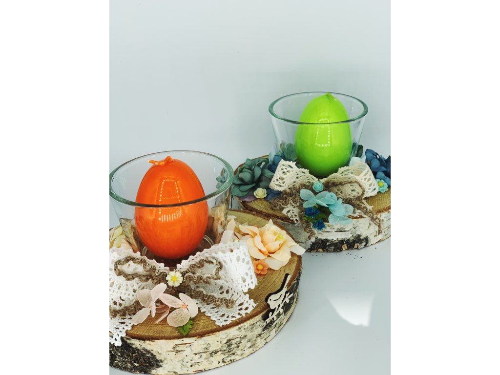 Svícen s lakovanou svíčkou zdobený umělými a sušenými přírodními květy, mašlí a drobnými dekoracemi, na březovém plátu. Svíčku si po vyhoření můžete vyměnit, protože je ve skleněném kalíšku. Rozměry dekorace: průměr svícnu 15 cm, výška 9,5 cm.