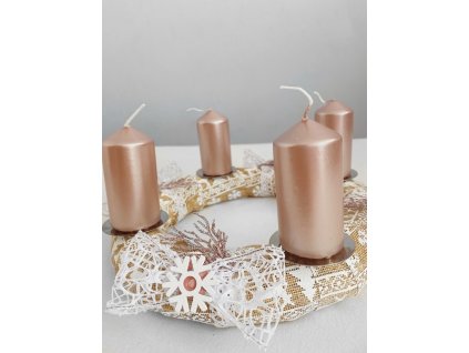 Svícen zdobený zvonečky s andílky, mašlemi a dalšími drobnými dekoracemi. Svíce je umístěna ve zdobeném skleněném kalíšku, vhodná dekorace na váš stůl. Průměr 15 cm.