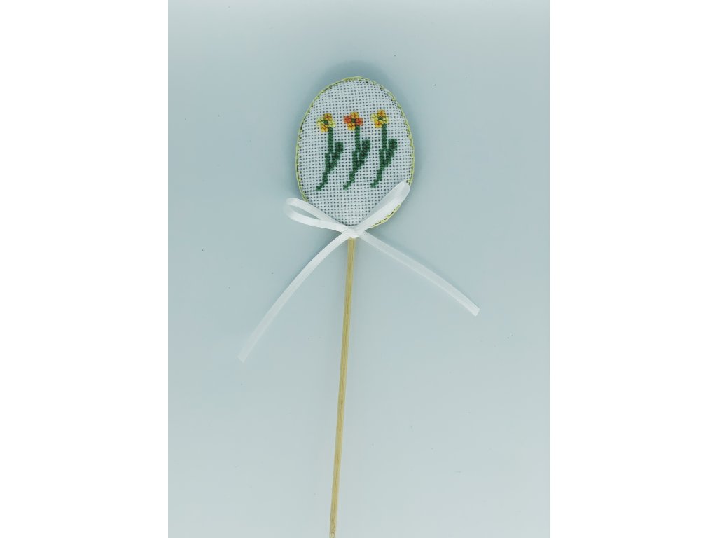 Ručně vyšívaný velikonoční zápich tři narcisy. K zapíchnutí do květináče případně dalšímu aranžování v interiéru. Rozměry vajíčka: 7 cm x 5,5 cm, tloušťka 5 mm. Celková výška se špejlí je 25 cm. Zadní strana je potažena režnou látkou. Velikonoční a jarní dekorace.