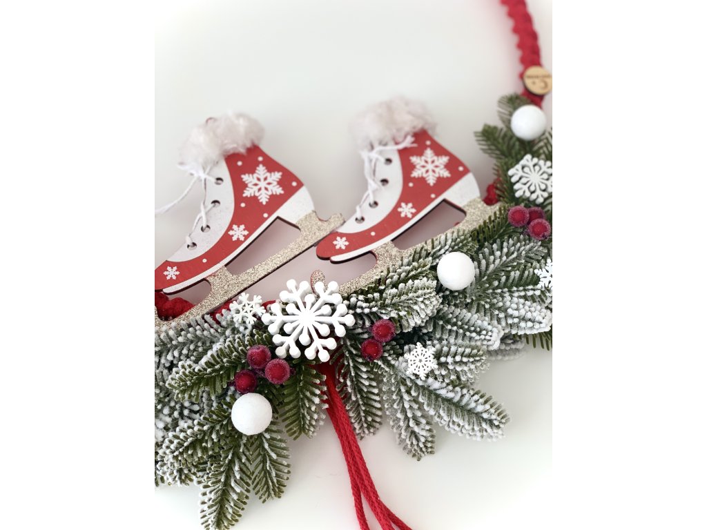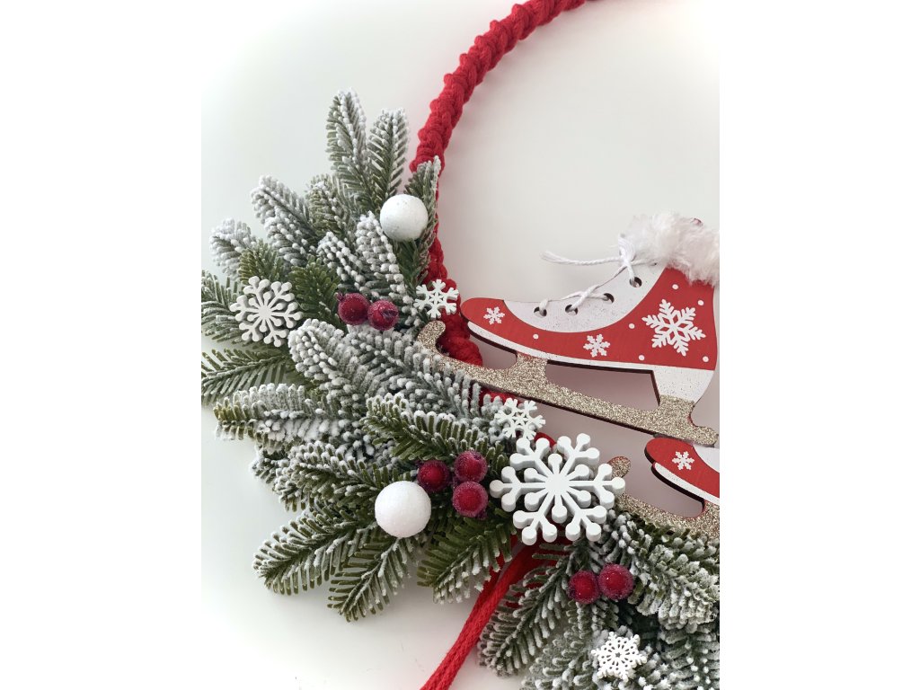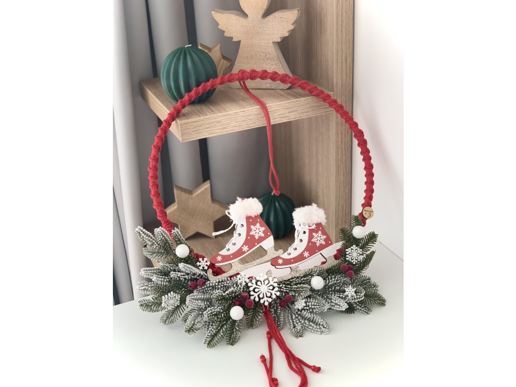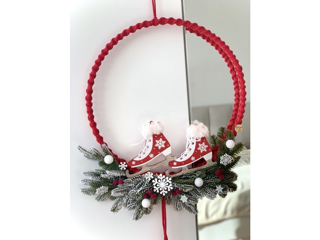 Velký vánoční a zasněžený macramé věnec bohatě zdobený trvanlivými dekoracemi. Originální český ruční výrobek.